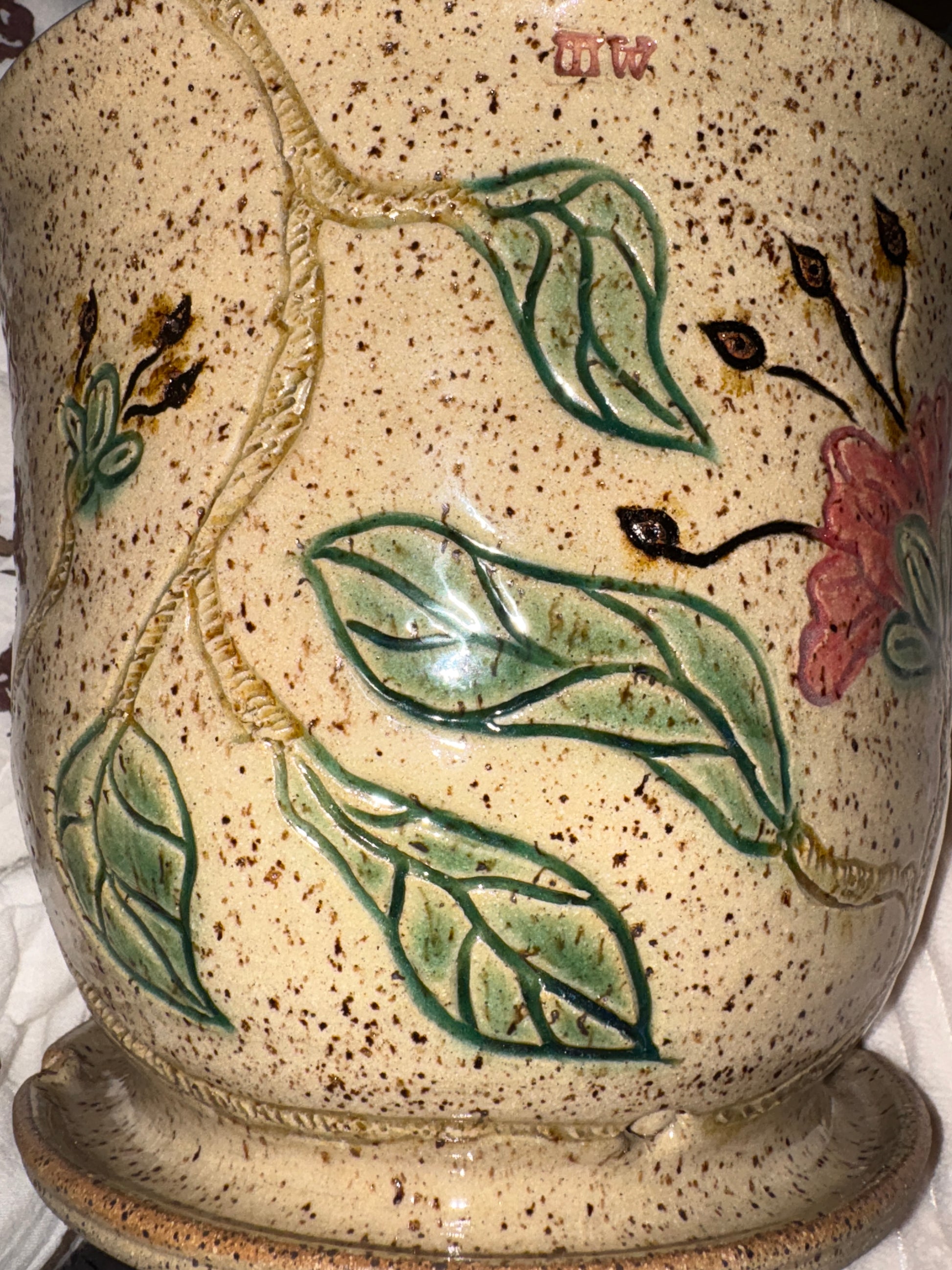 This plant pot is wheel thrown with drainage holes and a built in water dish, hand carved and painted fire flower design. Made with Speckle brown trout clay body and clear glazed. This planter is perfect for a number of different plants! (9in.Wx7in.H)
