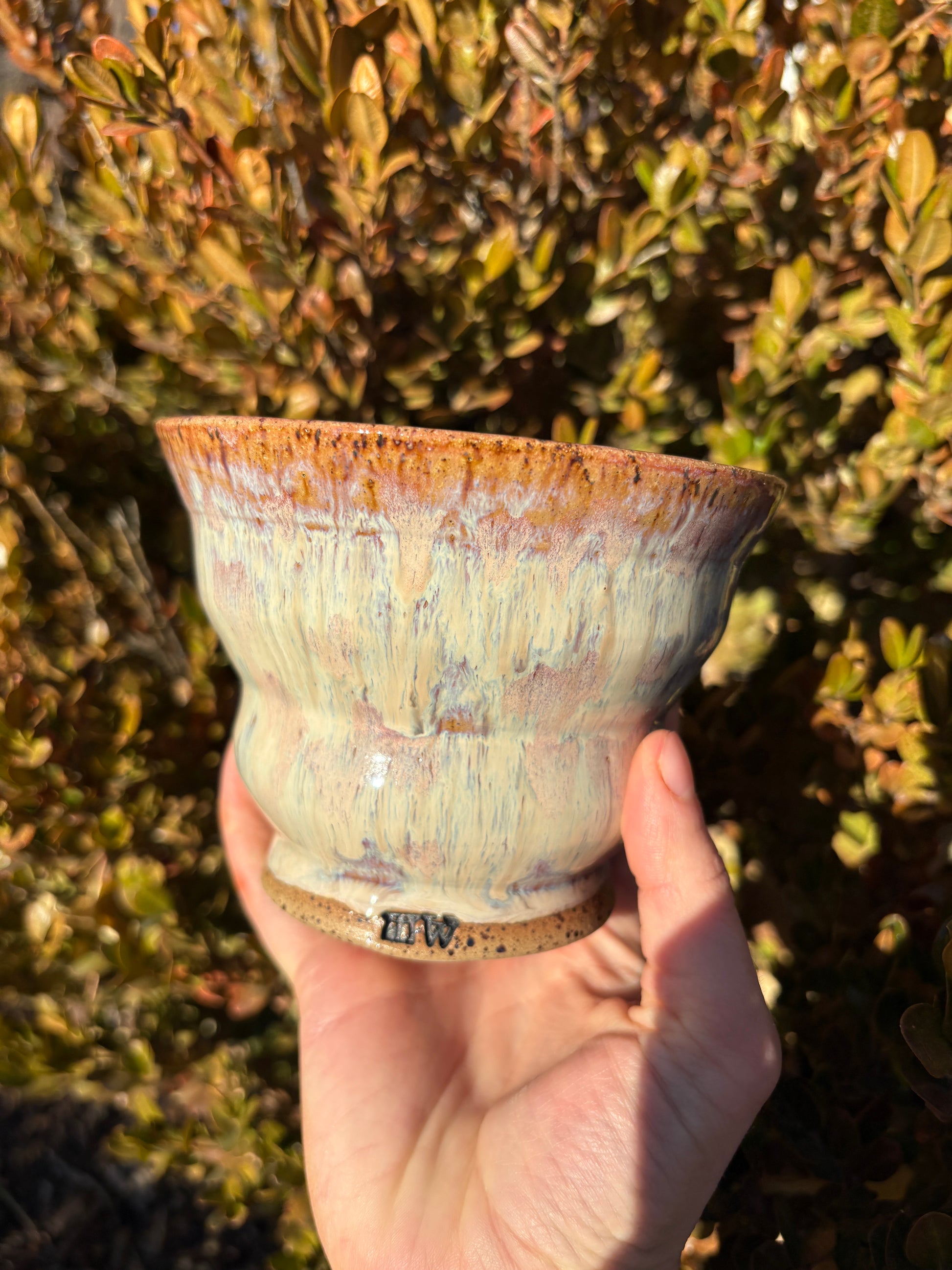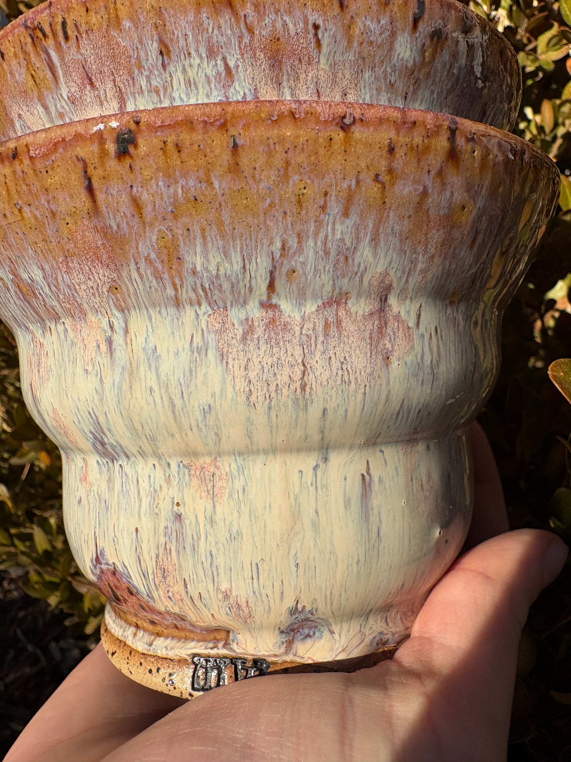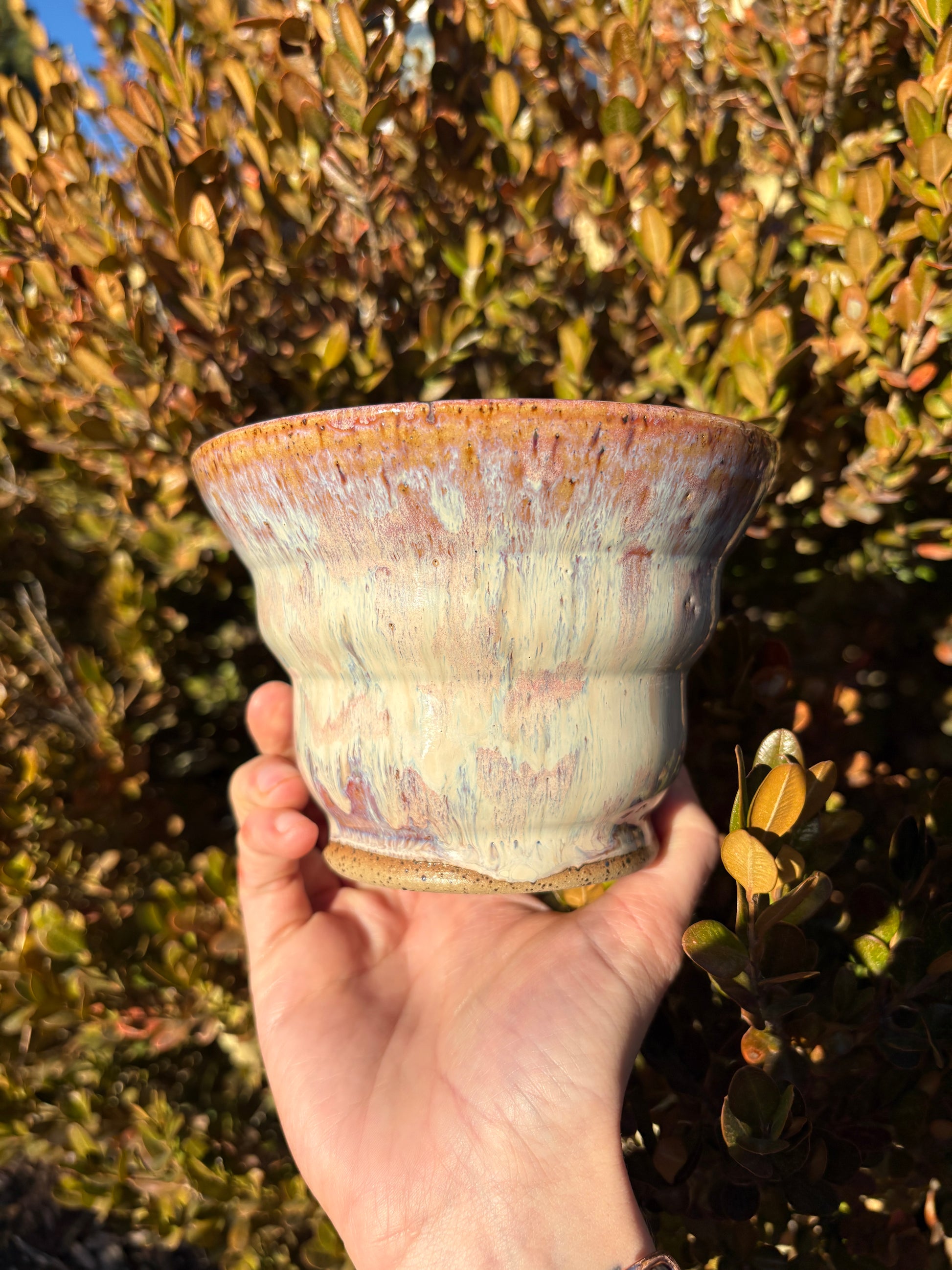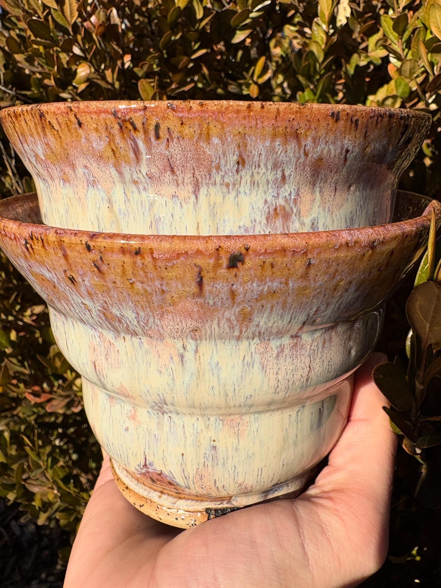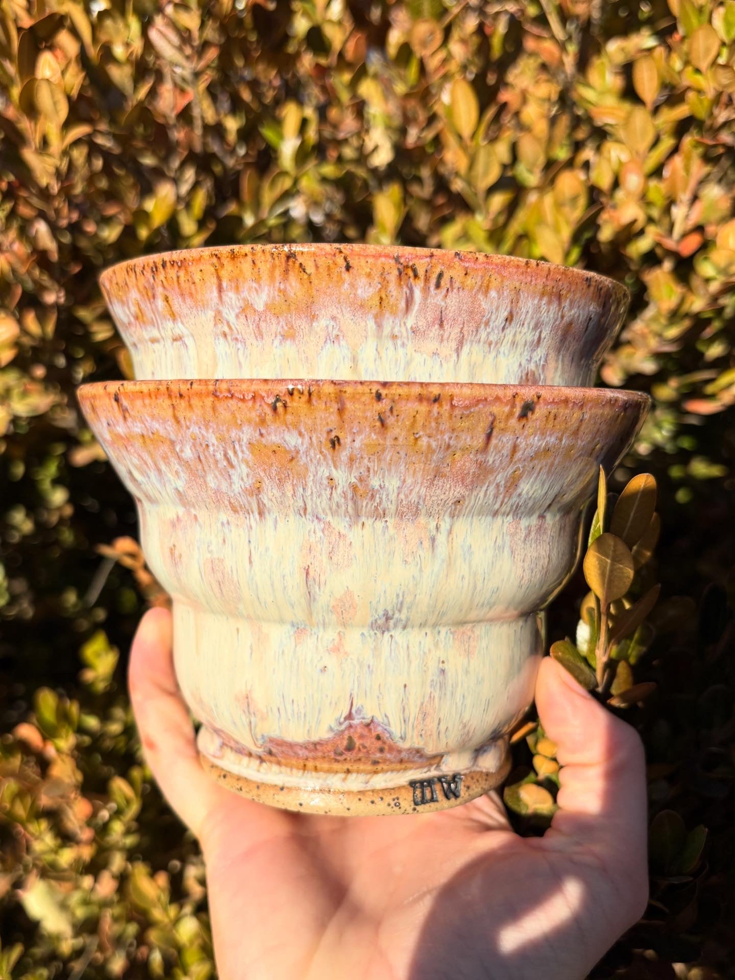 These two curvy bowls are perfect for any occasion. Lovely for serving, and casual for a bowl of cereal. This glaze has a beautiful flow of creamy pink and purple hues with a speckled effect in collaboration with the clay body.